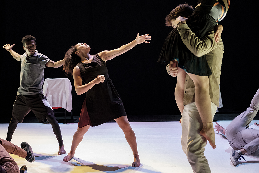 Têtes d’Affiche est un petit opéra sur la course au désir, à la manière d’une fugue de Bach, une superposition organisée de lignes mélodiques ici remplacées par des corps en mouvement. Ils se croisent sans se voir, êtres humains privés d’humanité traversant la scène, comme des ombres solitaires, des corps névrosés, robotiques. On ne sait jamais trop quelles sont les parts de hasard et de destin qui font que les êtres se rencontrent et forment une communauté. Mais il en est presque toujours ainsi : il est là, l’être humain, aux abois, n’acceptant de vivre avec les autres que s’il existe pleinement au sein même de ce groupe. Aimer l’autre, le flatter, lui sourire : juste pour lui prendre sa place, comme un jeu.
